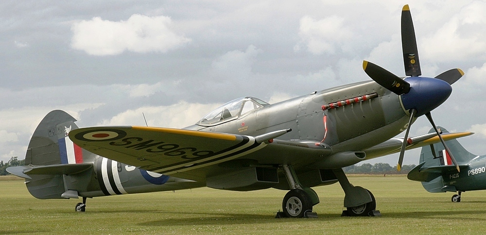 Supermarine Spitfire Tr. 9 (Serial No. TE308), Reg. No. N308WK. Initially allocated to 33 Maintenance Unit, then to 29 Maintenance Unit. Sold to Vickers-Armstrongs in July 1950. Converted to a two-seat trainer. Flew under Class B markings G-15-176. To Irish Air Corps in July 1951 as 163. Wheels-up landing on delivery at Baldonnel Airfield on 30 July. Withdrawn from service 9 September 1961. Sold to Tony Samuelson in April 1968, registered G-AWGB. Restored to flying condition in a month. Appeared in the movie Battle of Britain and also used for aerial filming where a camera was placed in the front cockpit allowing ‘through the windscreen’ shots to be captured, many of which appear in the film. Sold to Sir William Roberts in April 1970 then sold to Don Plumb in July. Registered CF-RAF. Reconverted to single seater in 1973. Sold to Thomas Watson and registered N92477. Sold to Woodson K. Woods and reconverted to two-seater in 1979, re-registered N308WK. Sold to Bill Greenwood in April 2003. Suffered an accident at Galveston, Texas on 26 April 200. It is being restored to airworthy status by QG Aviation.