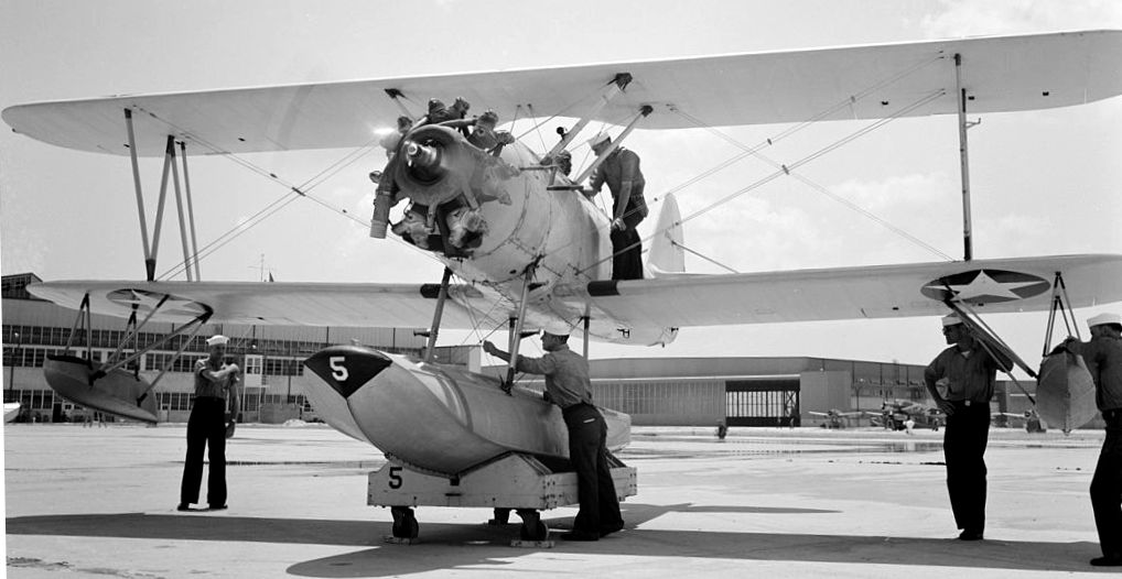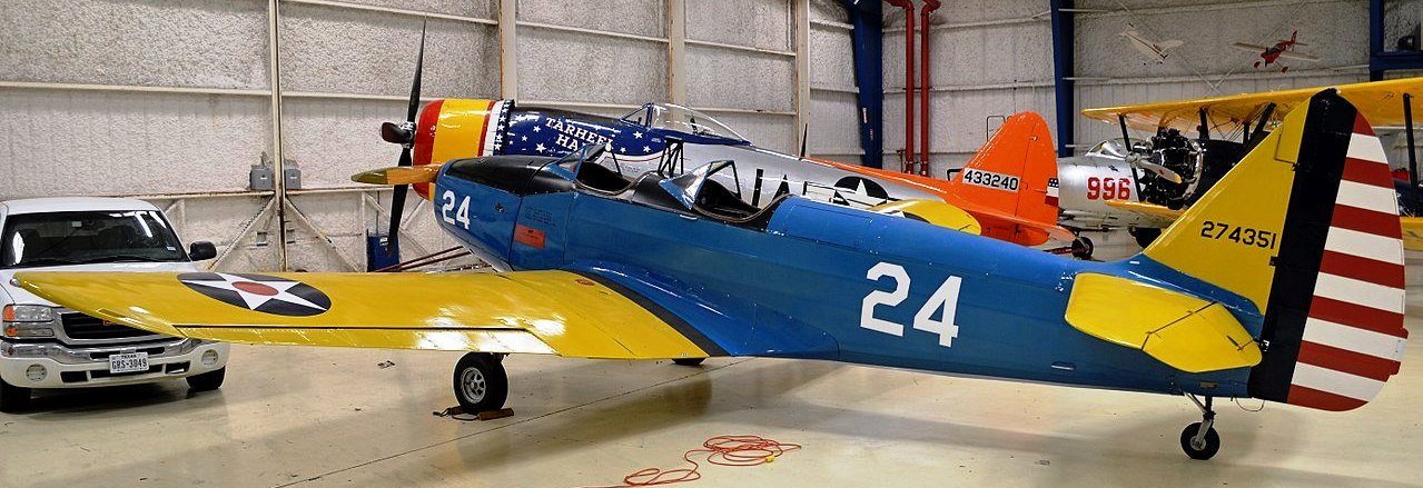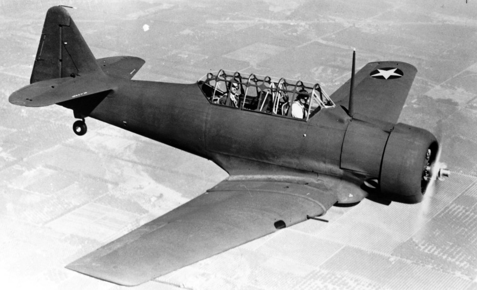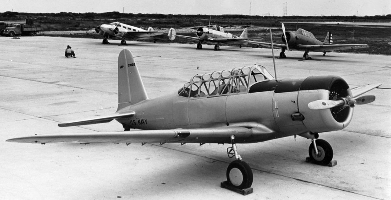 Vultee SNV-1 Valiant (BuNo. 03025) Naval Air Station Corpus Christi, Texas (USA), in1941. In the background are (l-r) a Beech SNB, a North American SNJ and a NJ-1 trainers.