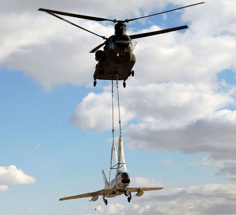 Boeing CH-47 Chinook helicopter, operated by the 1/189th Aviation, Nevada Army National Guard airlifts a Korean War-era North American F-86L Sabre (Serial No. 53-1045) into the Wendover Airport in Utah on 5 Nov 2008.  The F-86 was being transported from the Battle Mountain Airport, located in Nevada to its new home at the historic Wendover Airfield Museum. The Sabre is painted in the markings of the 191st Fighter-Interceptor Squadron, Utah Air National Guard which operated the F-86L from 1958-1961.