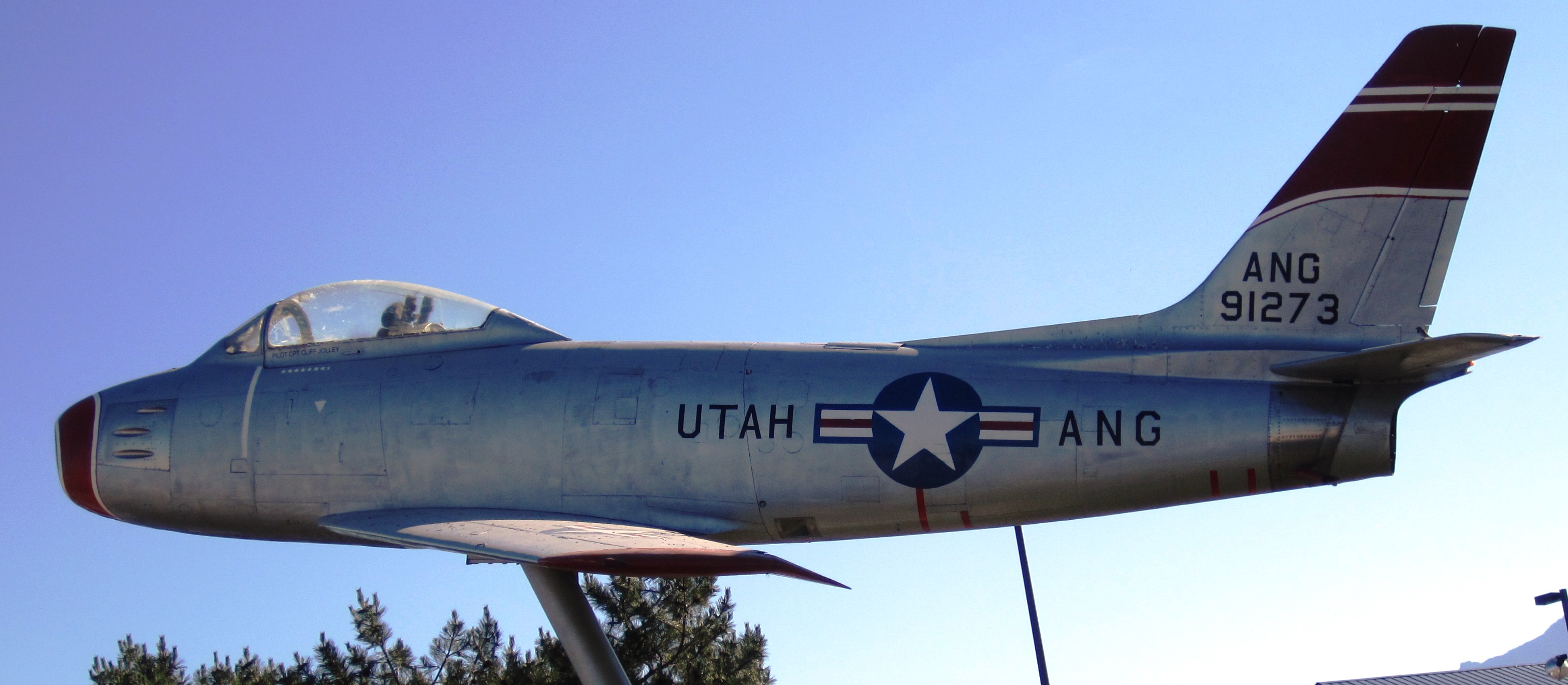 North American F-86 Sabre (Serial No. 91273), mounted on a pylon in front of the Utah Air National Guard building.