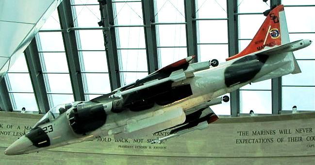 McDonnell Douglas AV-8B Harrier II (BuNo. 161396), C/N 512001/001.  On loan from the Patuxent River Naval Air Museum, this aircraft is now suspended from the ceiling inside the NMMC.