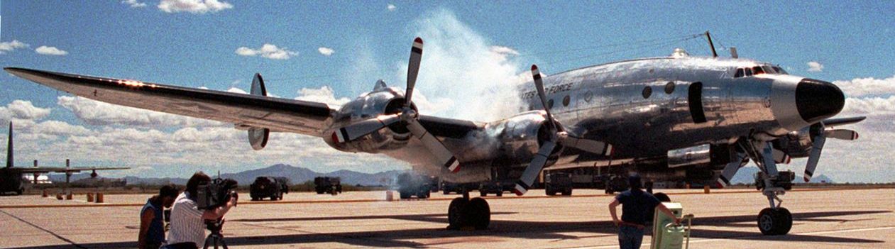 Lockheed VC-121A Constellation (Serial No. 48-0610), Reg. No. TBC, “Columbine II“.  This aircraft was once the presidential transport for Dwight D. Eisenhower in the early 1950s.  It was later replaced by VC-121E Super Constellation (Serial No. 53-7885), “Columbine III“, now with the National Museum of the USAF at Dayton, Ohio in 1954.  “Columbine II” was used as a VIP transport until it was retired from the USAF in 1968.  Work is underway to restore this aircraft to flight status.  (Karl Stoltzlus of Dynamic Aviation)