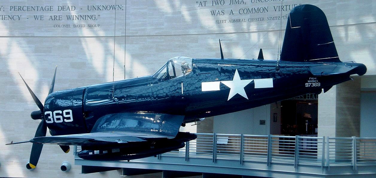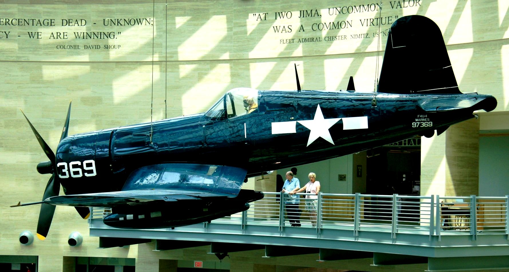 Vought F4U-4 Corsair (BuNo. 97369), C/N 9523.  Suspended from the ceiling inside the NMMC.