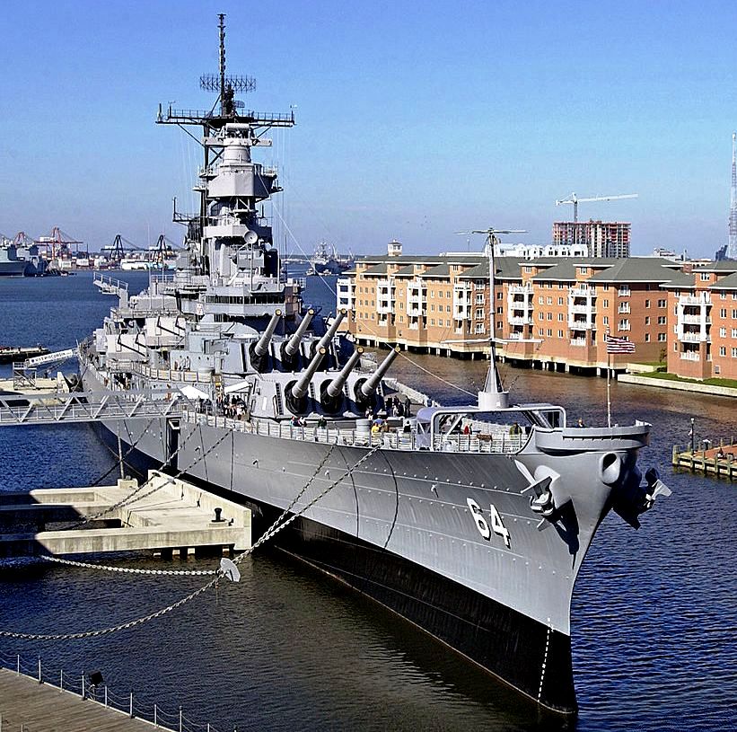 Battleship USS Wisconsin, (BB 64), on the Elizabeth River alongside the Nauticus Museum.