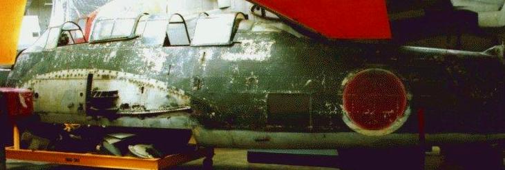Heinkel He 162A-2 Spatz (Sparrow),Volksjager (Wk. Nr. 120230), coded White 23, 1/JG1, painted (Wk. Nr. 120222), USA FE-504, later T2-504, with the tail of (Wk. Nr. 120222).  This aircraft is stored with the National Air and Space Museum, Steven F. Udvar-Hazy Center, Washington Dulles International Airport, Chantilly, Virginia.  This aircraft was one of thirty-one JG 1 aircraft manufactured by Heinkel at Rostock-Marienehe and captured by the British at captured at Leck, Nordfriesland, in Schleswig-Holstein, Germany on 8 May 1945.  It was painted with the number White 23, and its red-white-black nose bands were in reverse order from the usual paint scheme, which may indicate that the wing commander and high-scoring ace, Col Herbert Ihlefeld, flew this particular aircraft.  After transfer to Britain, the US Army Air Forces accepted the airplane and shipped it to Wright Field, Ohio, for evaluation. It received the foreign equipment number FE-504, later T2-504, and was later moved to Freeman Field, Indiana.  For unknown reasons, mechanics replaced the tail unit at Wright Field with the tail unit of aircraft Wk. Nr. 120222.  FE-504/T2-504 was apparently never flown.  Its flying days ended permanently when someone at Freeman Field neatly sawed through the outer wing panels sometime before September 1946.  The wings were reattached with door hinges and the jet was shipped to air shows and military displays around the country.  The US Air Force transferred the aircraft to the Smithsonian Institution in 1949 but it remained in storage at Park Ridge, Illinois, until transfer to the Garber Facility in January 1955. National Air and Space Museum, Steven F. Udvar-Hazy Center, Washington Dulles International Airport, Chantilly, Virginia.
