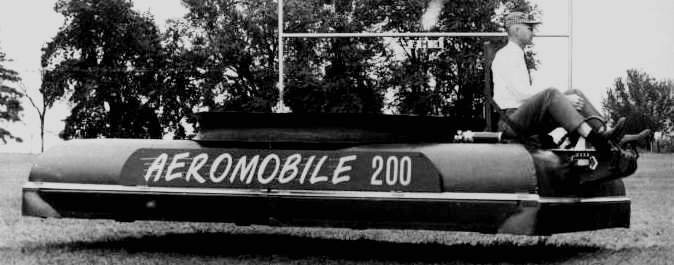 Bertelsen Aeromobile 200-1 Air Cushion Vehicle hovering over grassy football field, circa 1960. Dr. William R. Bertelsen, inventor of the 200-1, at the controls.
