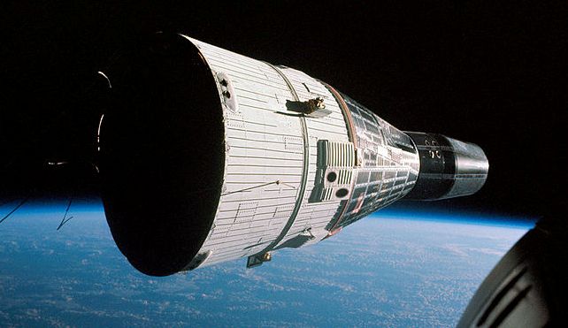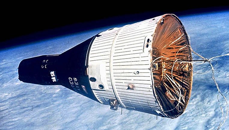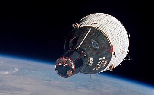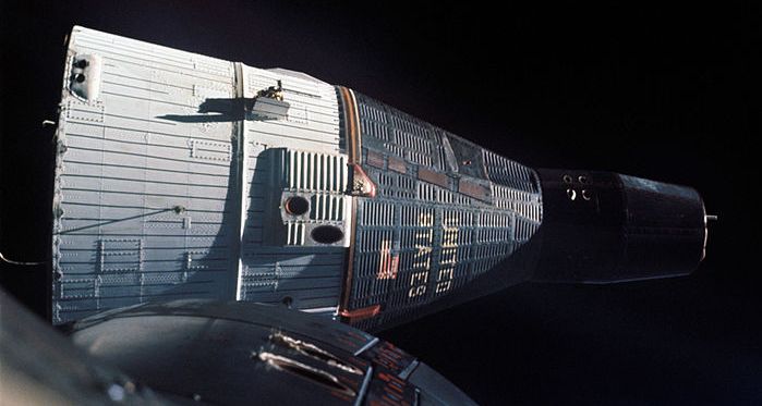 Gemini 7 as seen from Gemini 6 during their rendezvous in space, 15-16 Dec 1965.