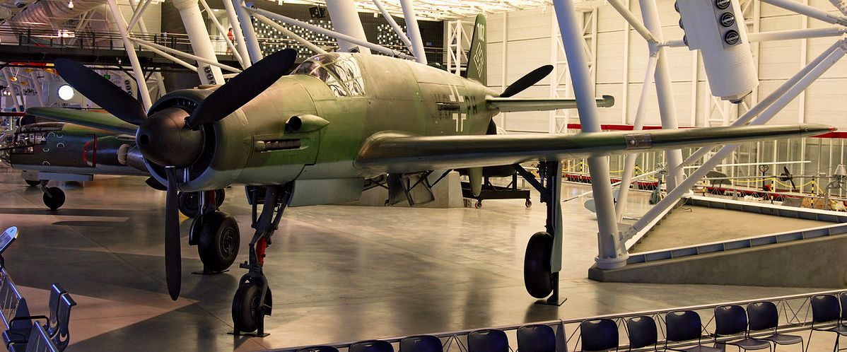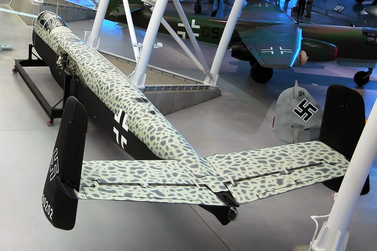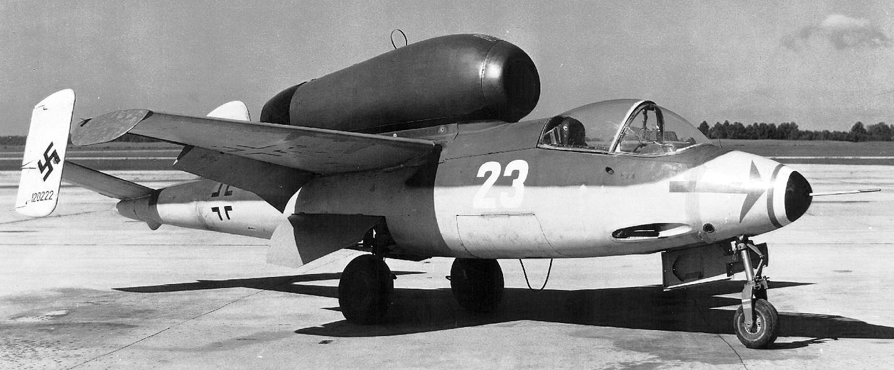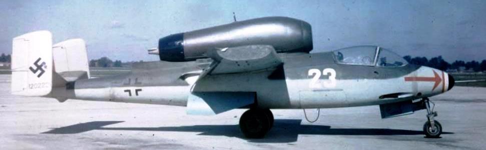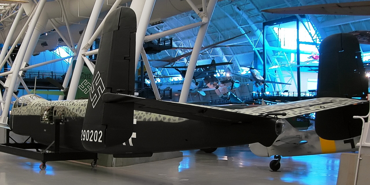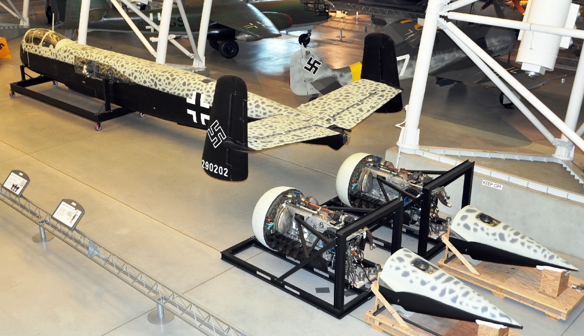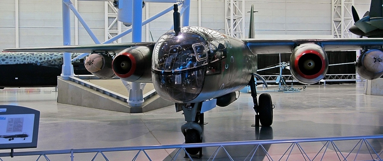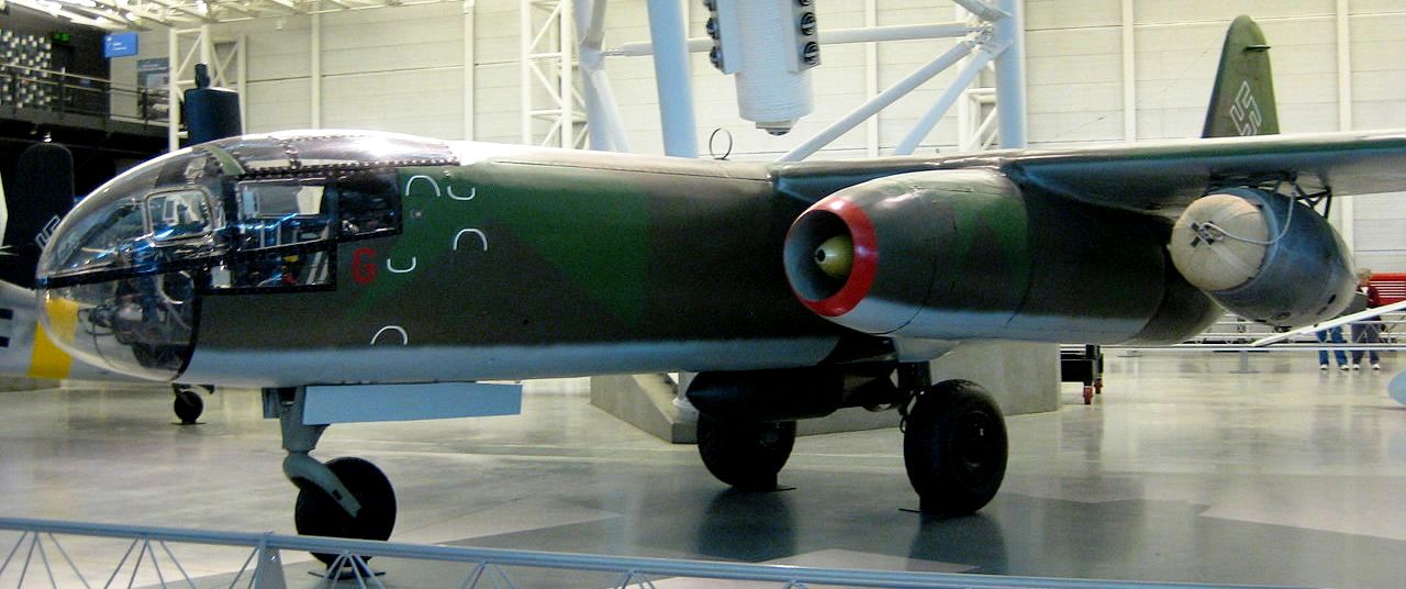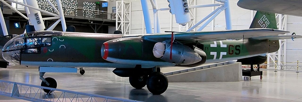 Arado Ar 234B-2 Blitz (Lightning), (Werknummer 140312), F1-GS, USA 50, Wk No. 505, Reg. No. 27, USAAF T2-1010/FE-1010, restored as F1+GS.  This aircraft was one of nine Ar 234s surrendered to British forces at Sola Airfield near Stavanger, Norway.  The aircraft had been operating with 9. Staffel III./Kampfgeschwader 76 (later reorganised as Einsatzstaffel) during the final weeks of the war, having operated previously with the 8th squadron, carrying the full-four-character Geschwaderkennungmilitary code of “F1+GS” on the fuselage sides, with the wing code of “F1” painted on in a much reduced size for “low-visibility” requirements.  This aircraft and three others were collected by the “Watson’s Whizzers” of the USAAF to be shipped back to the United States for flight testing.  The aircraft was flown from Sola to Cherbourg on 24 June 1945 where it joined 34 other advanced German aircraft shipped back to the U.S. aboard the British aircraft carrier HMS Reaper, arriving at Newark, New Jersey on 28 July.  Upon arrival two of the Ar 234s were reassembled (including 140312) and flown by USAAF pilots to Freeman Field, Indiana for testing and evaluation. 140312 was assigned the foreign equipment number FE-1010.  After receiving new engines, radio and oxygen equipment, 140312 was transferred to Wright Field near Dayton, Ohio and delivered to the Accelerated Service Test Maintenance Squadron (ASTMS) of the Flight Test Division in July 1946.  Flight testing was completed on 16 October 1946 though the aircraft remained at Wright Field until 1947.  It was then stored until transferred to the Smithsonian Institution.  Restoration was completed in 1989.