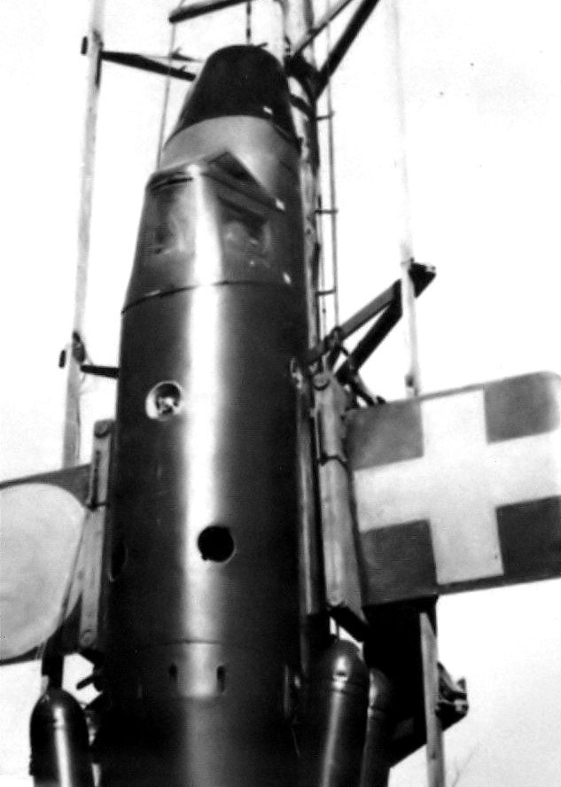 Bachem Ba 349B-1 Natter (Snake), shown in its vertical launch position, ca April 1945.  (Luftwaffe Photo)