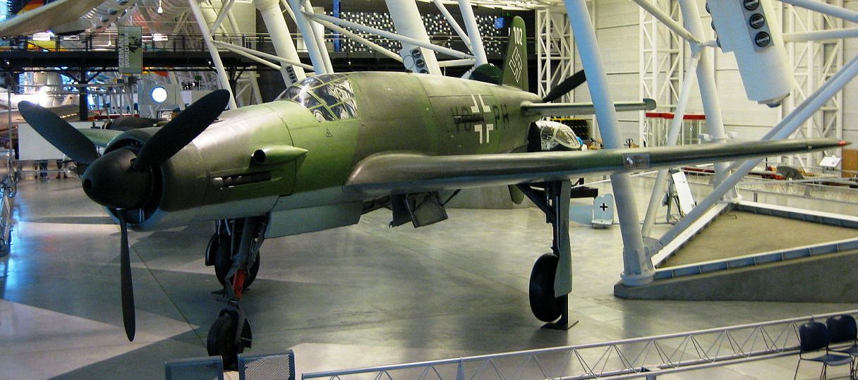 Dornier Do-335A-02 Pfeil (Arrow) (Werknummer 240102), VG+PH.  FE-1012.  This aircraft was assigned factory radio code registration, or Stammkennzeichen, of VG+PH.  The aircraft was assembled at the Dornier plant in Oberpfaffenhofen, Bavaria on 16 April 1945.  It was captured by Allied forces at the plant on 22 April 1945.  VG+PH was one of two Do 335s to be shipped to the United States aboard the Royal Navy escort carrier HMS Reaper, along with other captured German aircraft, to be used for testing and evaluation under a USAAF program called “Operation Sea Horse”.  VG+PH went to the Navy for evaluation and was sent to the Test and Evaluation Center, Patuxent River Naval Air Station, Maryland.  Following testing from 1945 to 1948, the aircraft was placed in storage at Norfolk, until donated to the Smithsonian in 1961.   In October 1974, VG+PH was returned to the Dornier plant in Oberpfaffenhofen, Germany for a complete restoration.  In 1975, the aircraft was restored by Dornier employees, many of whom had worked on the airplane originally.  They were amazed that the explosive charges built into the aircraft to blow off the dorsal fin and rear propeller prior to pilot ejection were still installed and active 30 years later.  The aircraft was on display in the Deutsches Museum in Munich until 1986 when it was returned to the Smithsonian.
