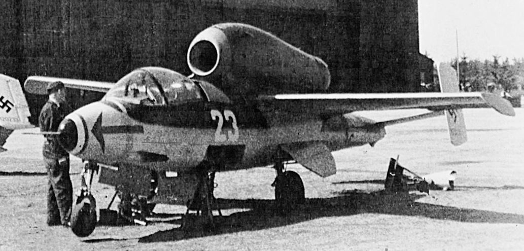 Heinkel He 162A-2, (Wk. Nr. 120230), coded White 23, 1/JG1, captured by the British at captured at Leck, Nordfriesland, in Schleswig-Holstein, Germany in May 1945. Transferred by the RAF to the USA, coded USA FE-504, later T2-504, now with the National Air and Space Museum, Steven F. Udvar-Hazy Center, Washington Dulles International Airport, Chantilly, Virginia.