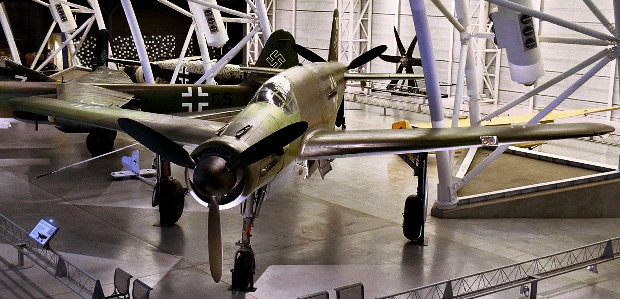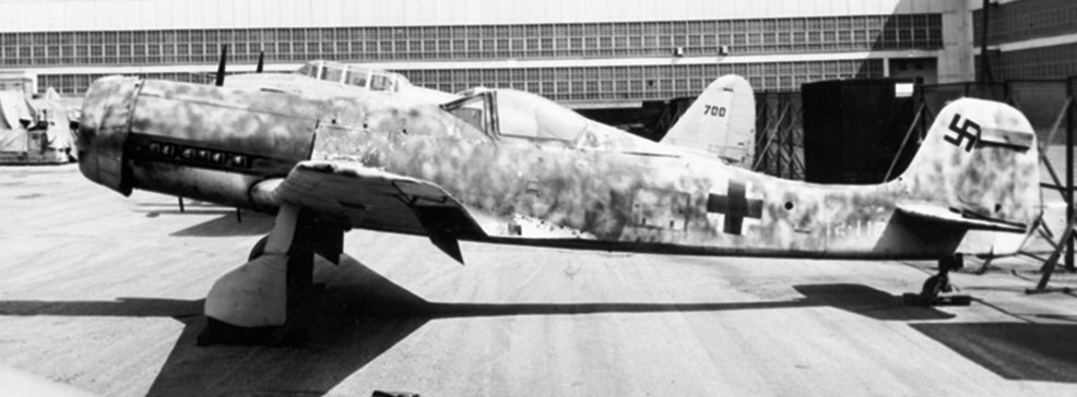 Research conducted late in 1998 may have revealed the airplane’s true identity as Werk-Nummer 150010, not 150003 or ‘020 as has been widely reported.  This places the airframe toward the end of the range of pre-production H-0 models, a variant marking the transition from the Ta 152 prototypes to full production Ta 152H-1 airplanes.  It was probably built at Focke-Wulf’s production facility at Cottbus, Germany, in December 1944, and delivered to Erprobungskommando Ta 152 at Rechlin, Germany, for service testing.  As with most Ta 152s produced, ‘020’ was apparently transferred to Jagdgeswader (fighter squadron) JG 301 in early 1945.  A Green ‘4’ was painted on the fuselage and this may have been the squadron identification and radio call sign “Green 4”.  The aircraft has a wooden tail and only (Wk. Nr. 150003) and (Wk. Nr. 150010) were fitted with this and on historical photos the overpainted remains of the code CW+CJ is visible which belongs to (Wk. Nr. 150010).  (Wk. Nr. 150020). was coded CW+CT.  Data courtesy of Peter W. Cohausz.  National Air and Space Museum, Steven F. Udvar-Hazy Center, Washington Dulles International Airport, Chantilly, Virginia.