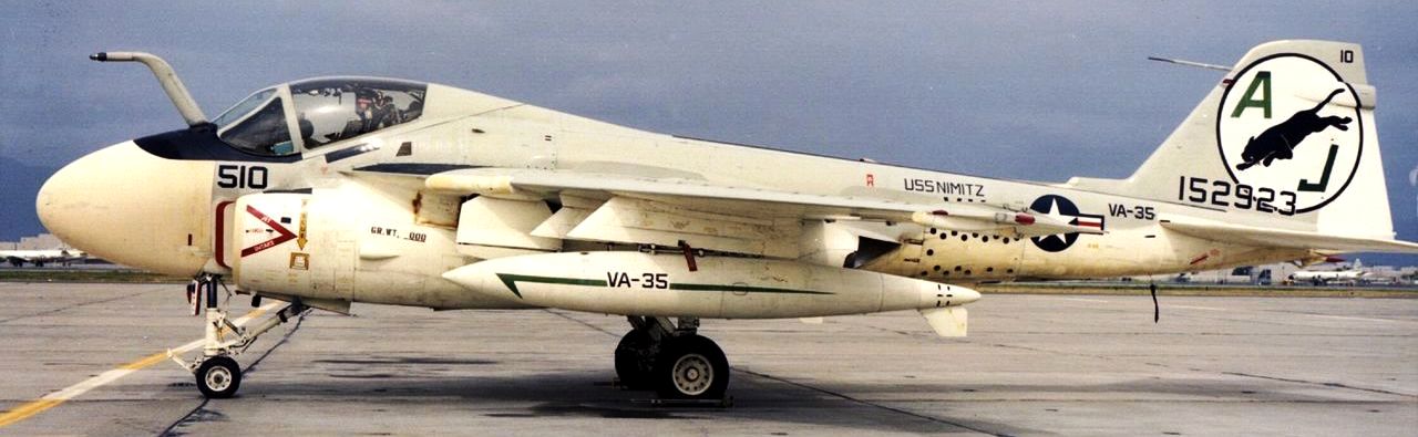 Grumman A-6E Intruder (BuNo. 152923) from Attack Squadron 35 Black Panthers at Naval Air Station Moffett Field, California, in 1975.  VA-35 was assigned to Carreir Air Wing 8 (CVW-8) aboard the aircraft carrier USS Nimitz (CVN-68).  This aircraft is today on display at the Naval Air Station Norfolk, Virginia.