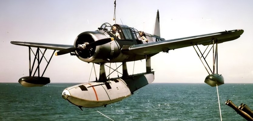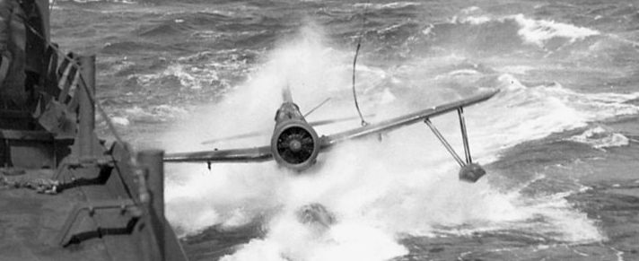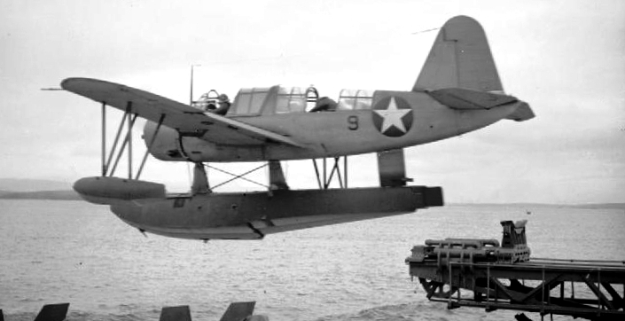 Vought OS2U Kingfisher taxiing towards the recovery sled for recovery by the battleship USS South Dakota (BB-57) in April 1943.  The USS South Dakota was operating in the North Atlantic at that time.