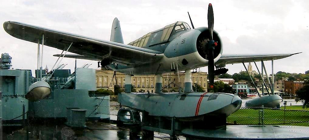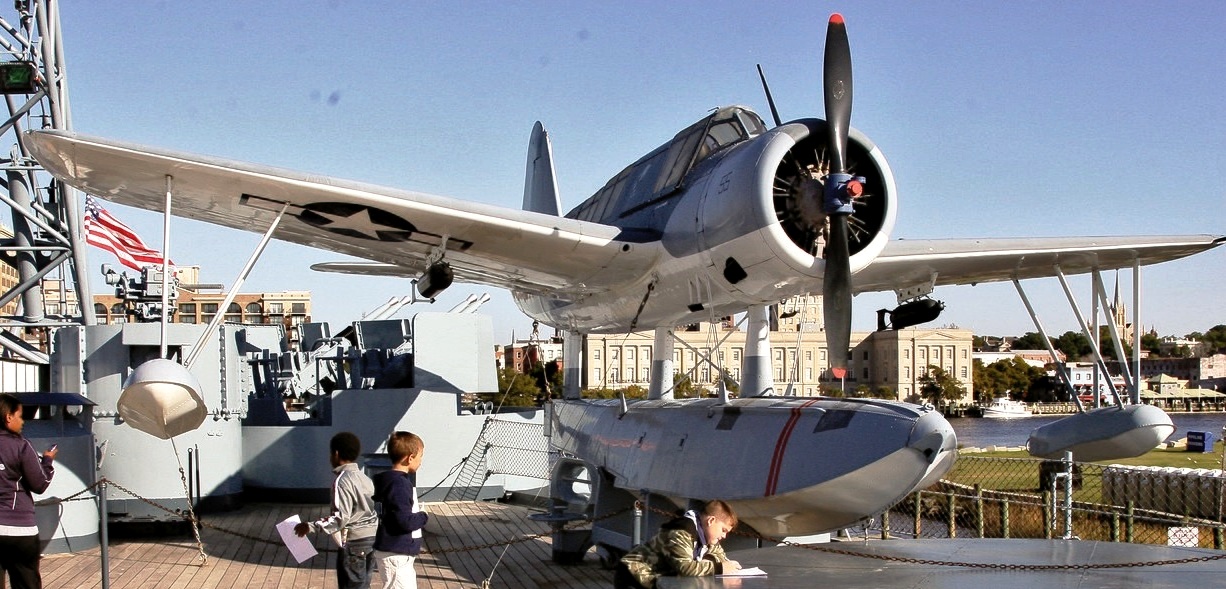 Vought OS2U Kingfisher aboard the battleship USS North Carolina (BB-55).  his aircraft is one of the type used by the USS North Carolina during the Second World War, and crashed in 1946 on Calvert Island, British Columbia, Canada, while on a flight to Alaska.  It was restored in 1970-71 by members of Vought Quarter Century Club of Dallas, Texas.