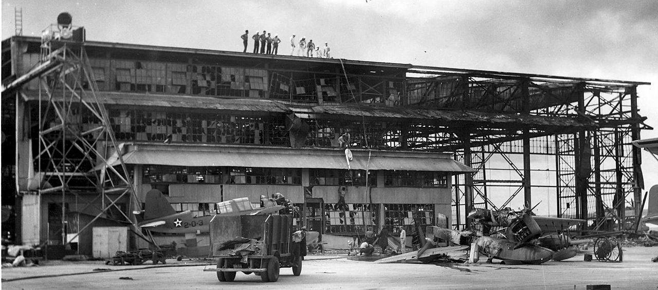 U.S. Navy personnel inspect a damaged hangar at Naval Air Station Ford Island in the aftermath of the Japanese attack on Pearl Harbor, Hawaii, December 1941.  A destroyed Vought OS2U Kingfisher is visible on the right, another OS2U of Observation Squadron VO-2 is worked on.
