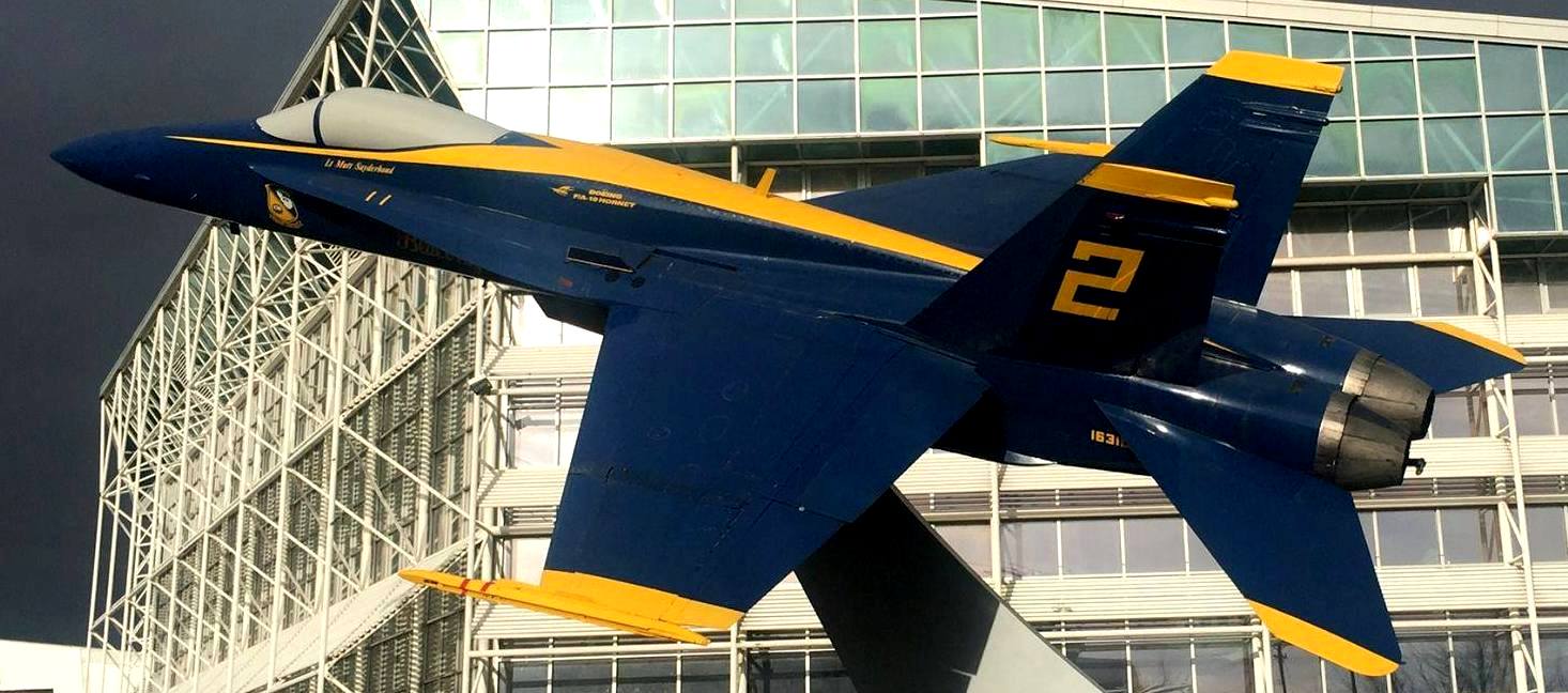 McDonnell Douglas F/A-18C Hornet (BuNo. 163106), Blue Angels No. 2. This aircraft mounted on a plinth outside the main entrance to the museum.