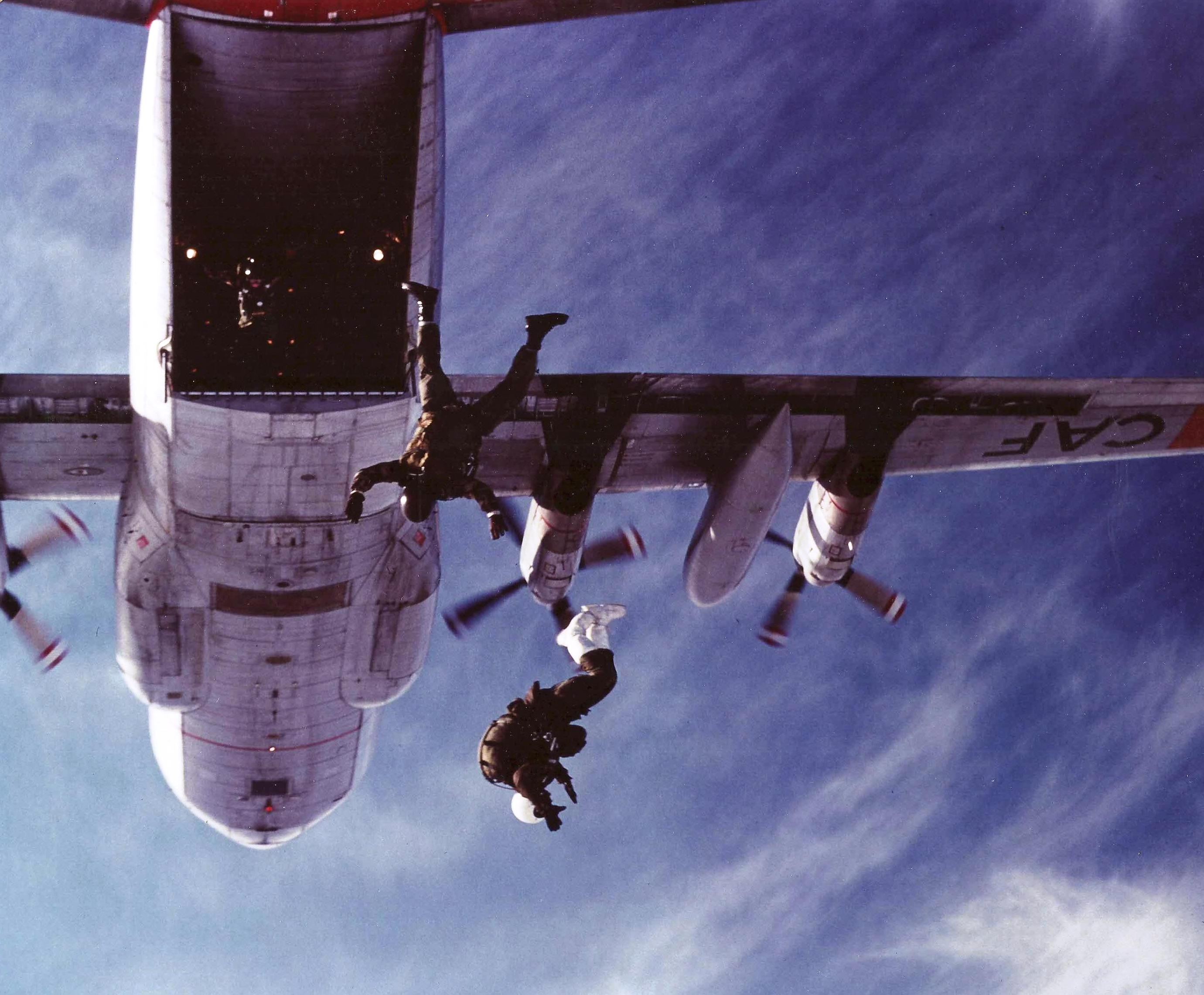 “It’s like riding a waterfall. Just turn, step off the ramp and catch thefirst blast of wind from the aircraft’s “propwash,” he said. “OK,” I thought, as I turned and stepped offinto the airspace below us. It was justlike he said it would be. It was like ridinga waterfall. For one brief moment I feltlike I was floating perfectly still, then suddenly the air-wave came roaringback at me in a blast of wind from the four powerfully churning propellerblades of the C-130 Hercules transport aircraft I had been inside momentsbefore. The wind hit me full force as Iflashed away from the aircraft like a cascading maple-leaf in the fall, andthen suddenly…it was quiet. So quiet Ithought I could hear my heart beating, although I could feel the wind rushingabout my face. For a few brief seconds,I had actually begun to slow down from the flying speed of about 160-mph when Iexited from the Hercules. Now my fallingbody began to pick up speed. I was inthe process of accelerating to what we skydivers call “terminal velocity,”which is a downward rate of fall of 120 mph. High above me the aircraft faded away into the distance. At the same time that old familiar and yetstill incredible feeling of flight continued to build inside me. “God,” I thought, “thank you, it is so great to be alive!”