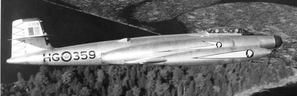 de Havilland DH 100 Vampire, RCAF (Serial No. 17021), GO, in flight.