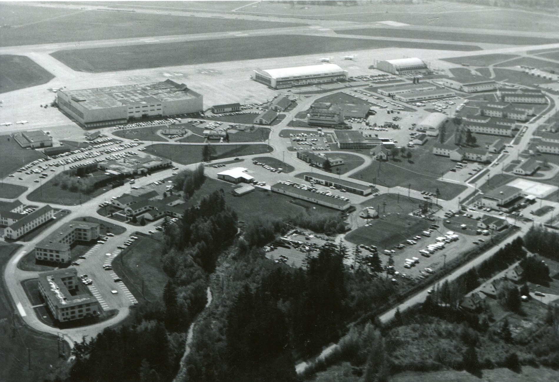 CFB Comox, British Columbia, prior to 1984. There are white painted Buffalo transports and Voodoo fighters in the photo. No. 409 ‘Nighthawk’ AW (F) Squadron, flew their last alert on 30 June, 1984.