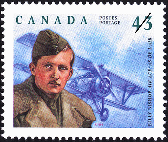 Stamp commemorating Air Marshal William Avery Bishop, VC, CB, DSO & Bar, MC, DFC, ED. He was a Canadian flying ace of the First World War. He was officially credited with 72 victories, making him the top Canadian and British Empire ace of the war, and also received a Victoria Cross.