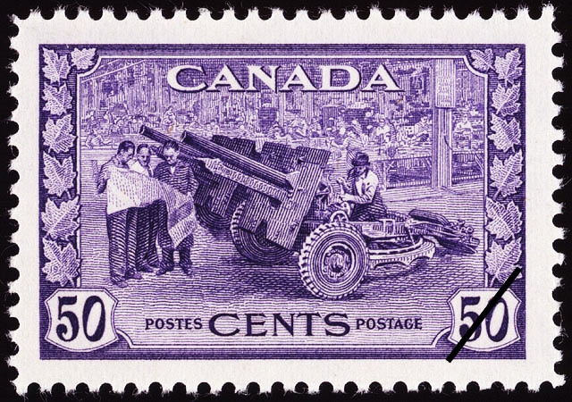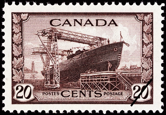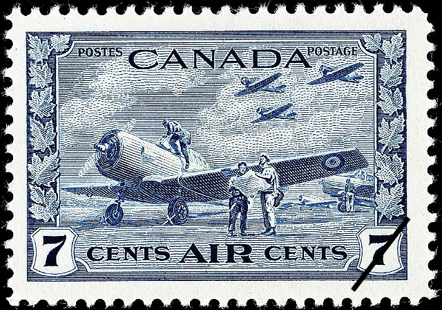 On July 1 1942, a new series of definitive stamps was issued showing Canada’s contribution to the war effort of the Allied Nations. The Post Office Department issued stamps portraying King George as head of the Armed Forces in naval, military and air force uniforms. Subjects depicting Canada’s munitions, war supplies, shipbuilding, agriculture, her importance as a great air-training centre, and as a source of food were chosen for the pictorial stamps.