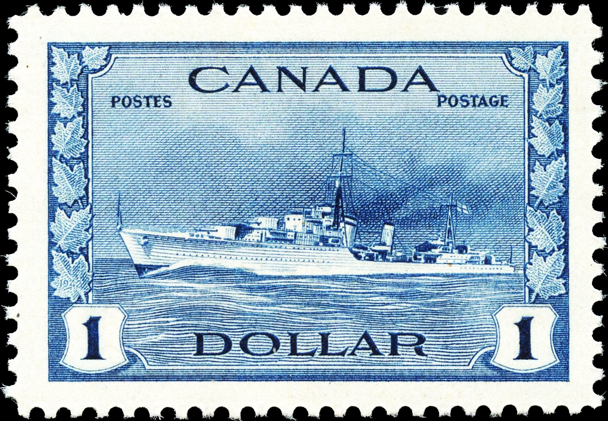 $1.00 deep blue “Tribal Class Destroyer, Royal Canadian Navy” stamp from the War Issue. It is #262, issued in 1942.