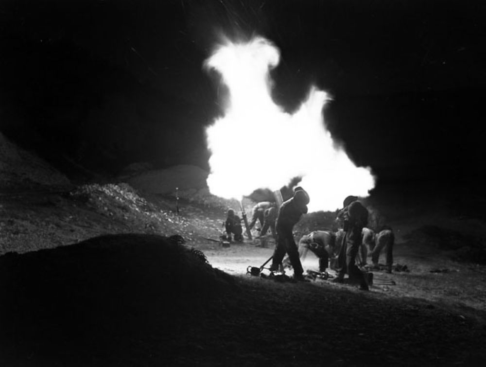 3-inch Mortar, 1st Cdn Corps, night fring, Italy, 6 April, 1944.