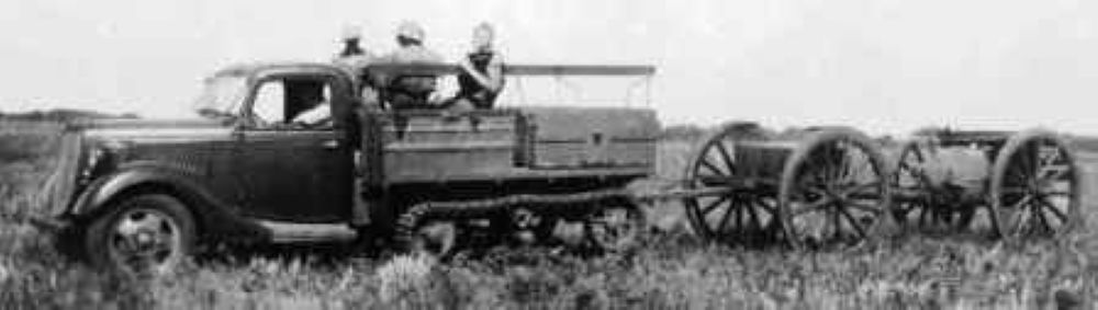 18-pounder QF Mk. II Field Gun with limber being towed by a 1936 model Ford-Marmon-Harrington half-track used by the Royal Canadian Artillery, Camp Shilo, 1937.