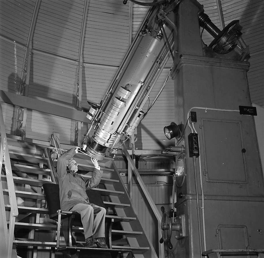 Royal Astronomical Society of Canada (RASC) astronomer Malcolm M. Thomson inserts a photographic plate into a camera mounted on a large telescope housed in the Department of Mines and Technical Surveys Dominion Radio Astrophysical Observatory, Ottawa, Ontario, in 1959. The Observatory was officially opened on 22 June 1960. The Observatory remains a notable landmark on the grounds of the Central Experimental Farm National Historic Site of Canada, a short walk down the street from the Canada Agricultural and Food Museum in Ottawa.