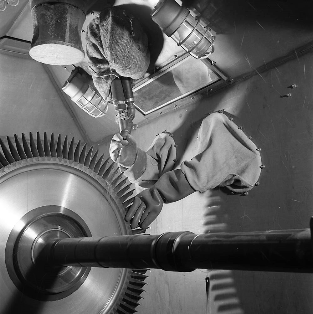 Repairs being carried out on a Canadair CL-13 Sabre engine turbine blades in Toronto, Ontario in 1952.