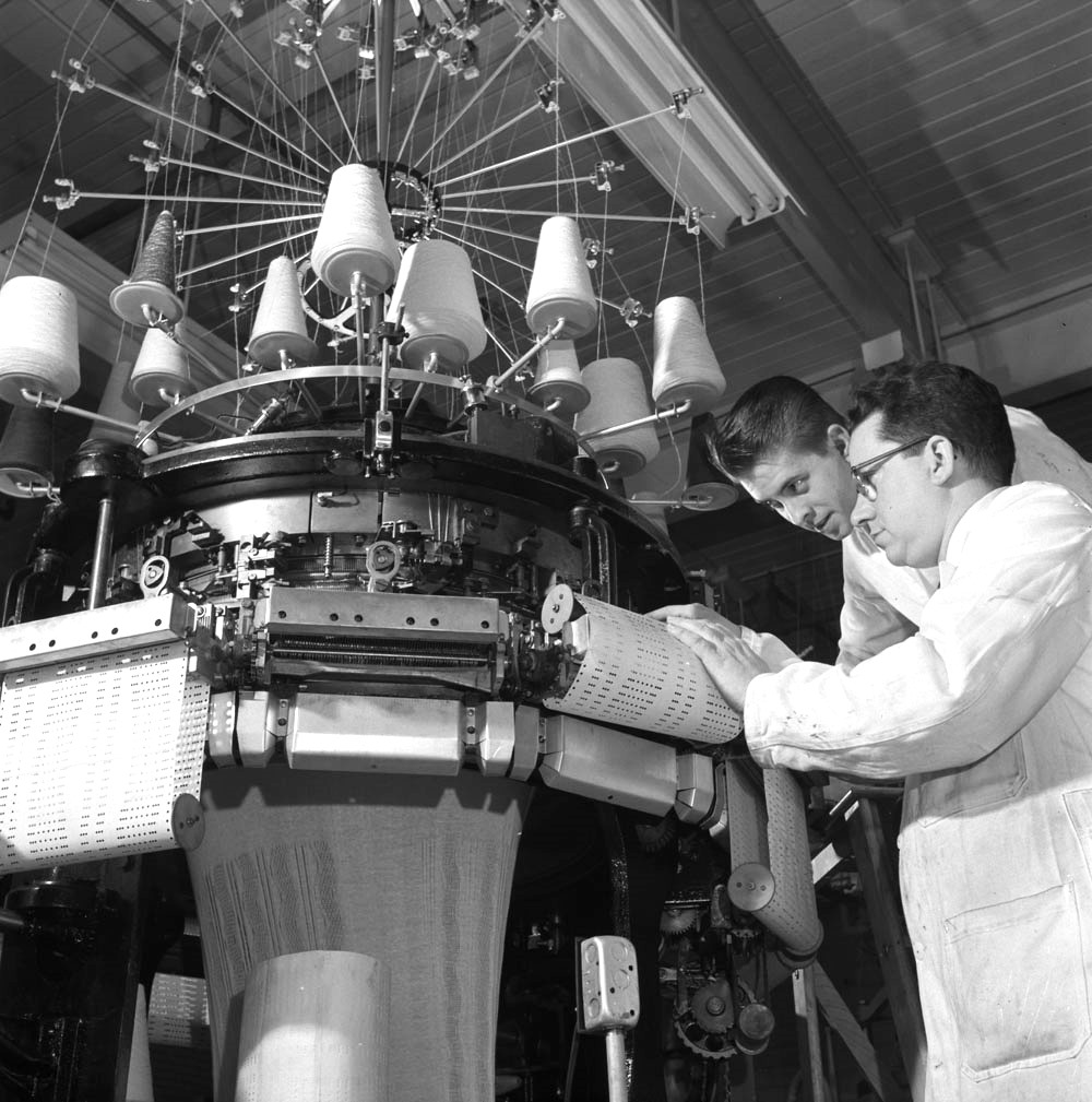 A student is taught how to fix a needle on a sweater-knitting machine, 1957.