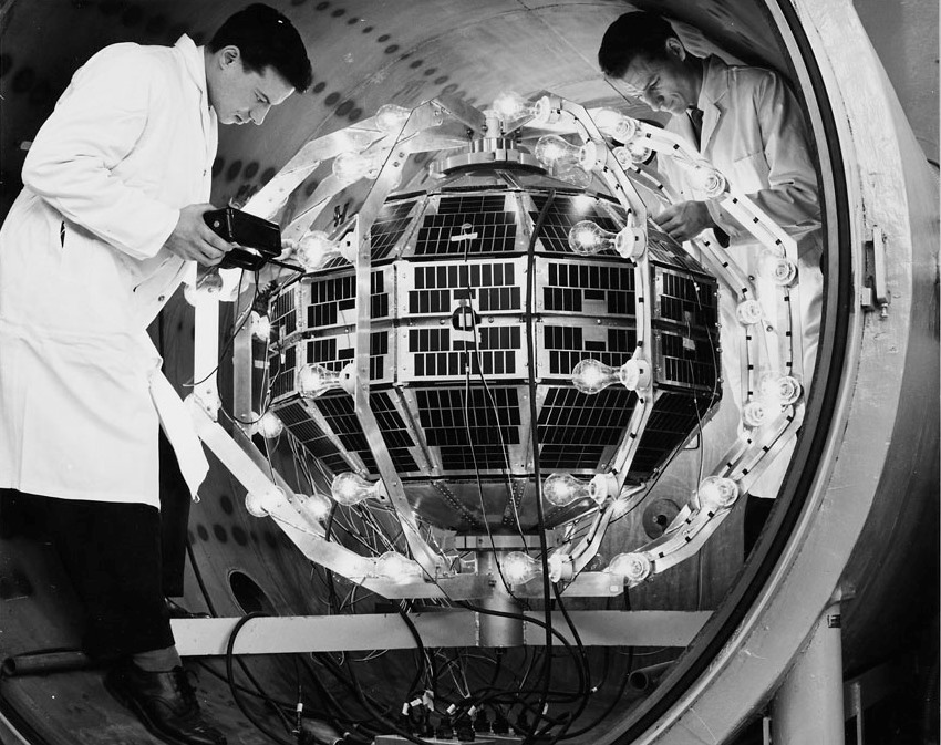 Defence Research Board technicians at the Canadian Armament Research and Development Establishment, in Val Cartier, Quebec, readying a satellite prototype for a test, ca 1961. Alouette 1 was launched via Thor-Agena-B two-stage rocket by NASA from the Pacific Missile Range at Vandenberg Air Force Base, California, USA at 06:05 UTC on September 29, 1962, into orbit around Earth. The 145.6 kilograms (321 lb) satellite was placed into an almost circular orbit with an altitude of 987 kilometres (613 mi) to 1,022 kilometres (635 mi) with an inclination of 80.5°. The launch made Canada the third nation, after the USSR and the United States, to design and construct its own satellite. Alouette was used to study the ionosphere, using over 700 different radio frequencies to investigate its properties from above.