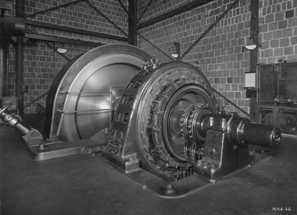 McIntyre Mine – (Surface) Main hoist 50-ton fly wheel – slip regulator on extreme right background. Schumacher, Ontario, 1936.
