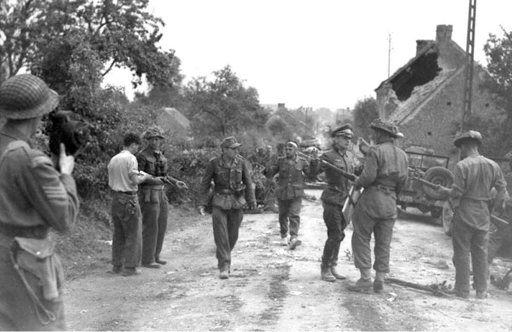 Major David V. Currie (left, with pistol in hand) of The South Alberta Regiment accepting the surrender of German troops at St. Lambert-sur-Dives, France, 19 August 1944.