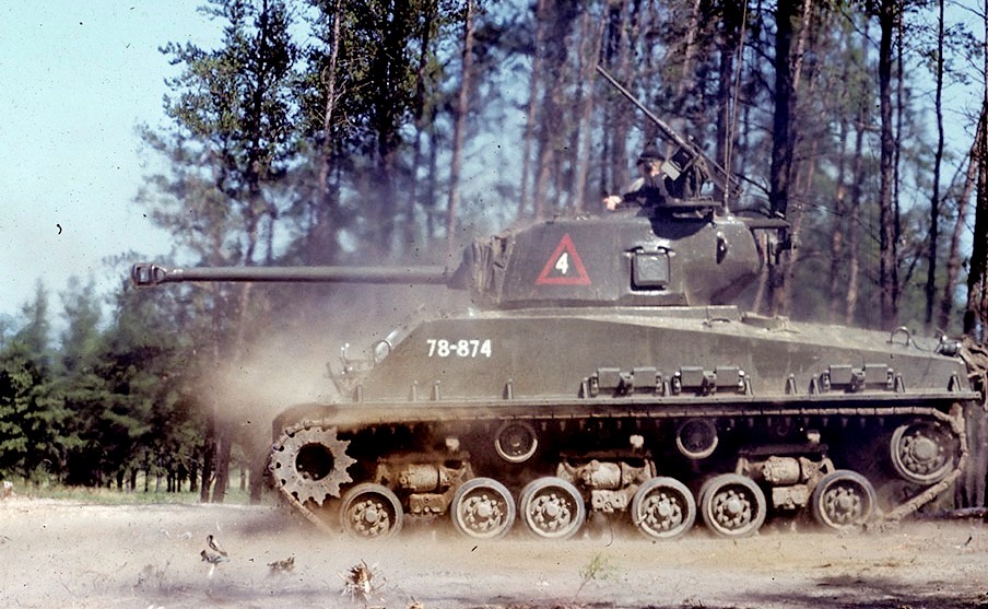 Canadian Medium Tank M4A2(76)W HVSS Sherman, nicknamed “Easy 8”, on the range at Camp Gagetown. Note the US M1 helmet liners being used at tank helmets.