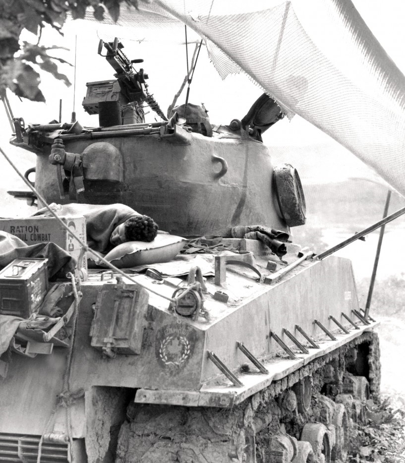 Trooper Andy Parenteau of the Lord Strathcona’s Horse (Royal Canadians) sleeps on the back of a Canadian Sherman M4A2(76)W HVSS tank, Korea. Note the American ration box and United Nations/Canada crest on the tail.