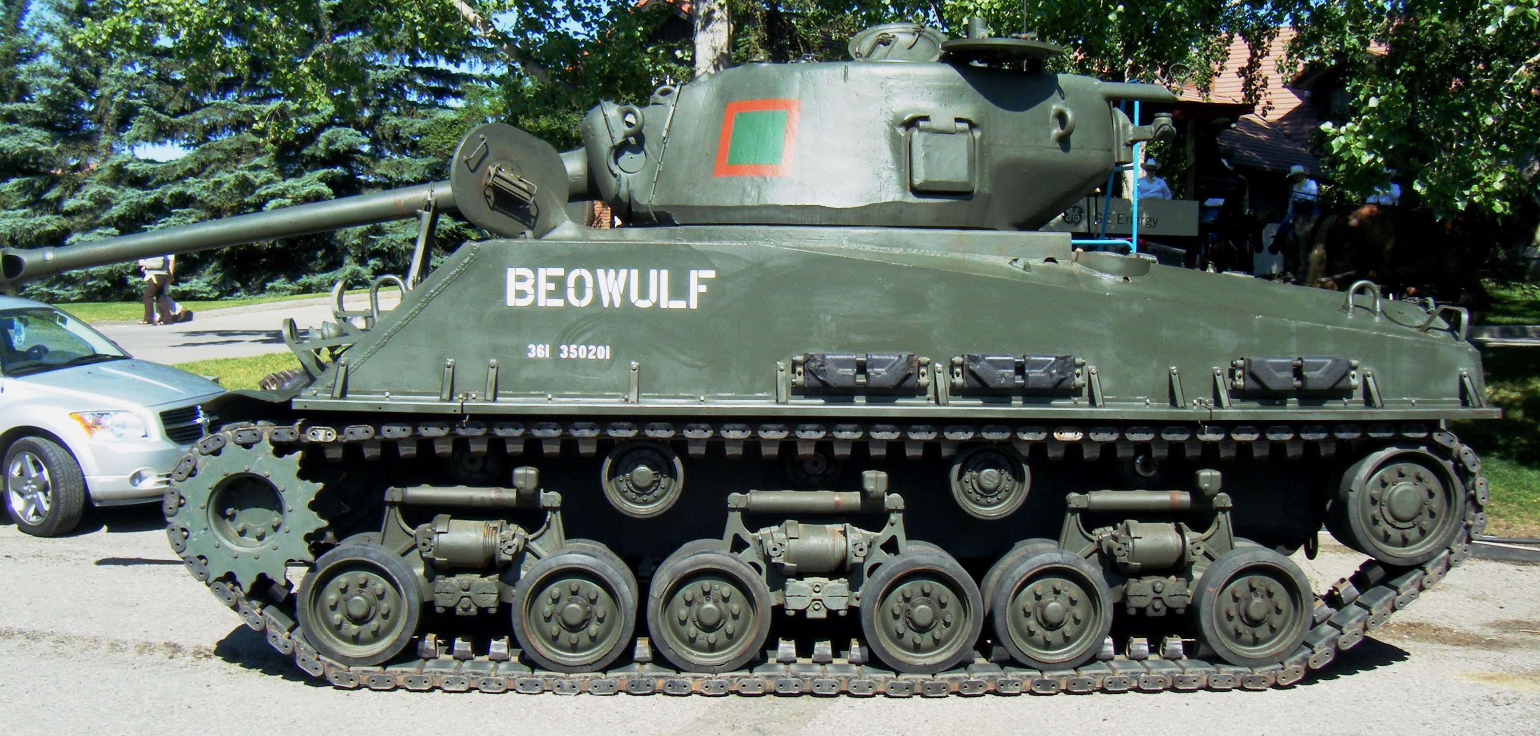 Canadian Medium Tank M4A2(76)W HVSS Sherman, nicknamed “Easy 8”, Manufacturer’s Serial No. 65011, US Army Registration No. 30122990, DND Registration No. TBC, built by Fisher. Painted as 361, 350201, “Beowulf”, when it was at 3 CDSB Edmonton, Alberta. This tank was owned by Jim Rice. It is now with the Ontario Regiment Museum.
