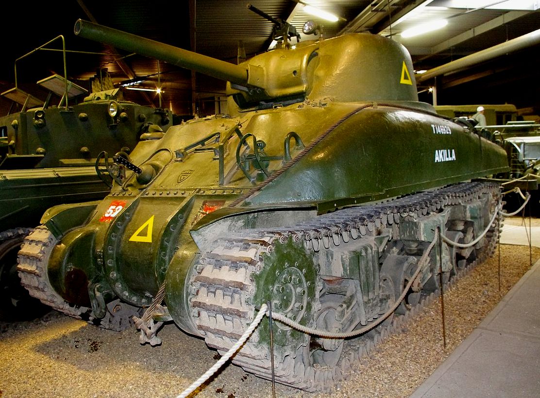Tank, Medium, M4A1, Cruiser, Grizzly 1, DND, Montreal Locomotive Works, (75-mm gun), Duxford, Imperial War Museum, UK. M4A1 Grizzly I (CT160194) is painted as Serial No. T146929, “Akilla”, a regular 75mm Sherman from A Squadron, Sherwood Rangers Yeomanry, commanded by Sgt George Dring. After landing in the first wave at Gold beach, Sgt Dring fought inland and in two days of fighting in Normandy at Rauray and Bois du Homme, destroyed 3 x Tiger, 1 x Jagdpanther, 2 x Panthers and 2 x Pz.IV. They also captured 2 x Tiger that bogged down behind one they destroyed.