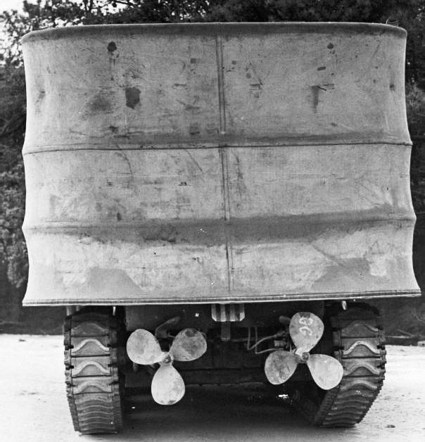 M4A4 Sherman Duplex Drive with screen up, rear view showing the two propellors. 1944. (IWM Photo MH 2214)
