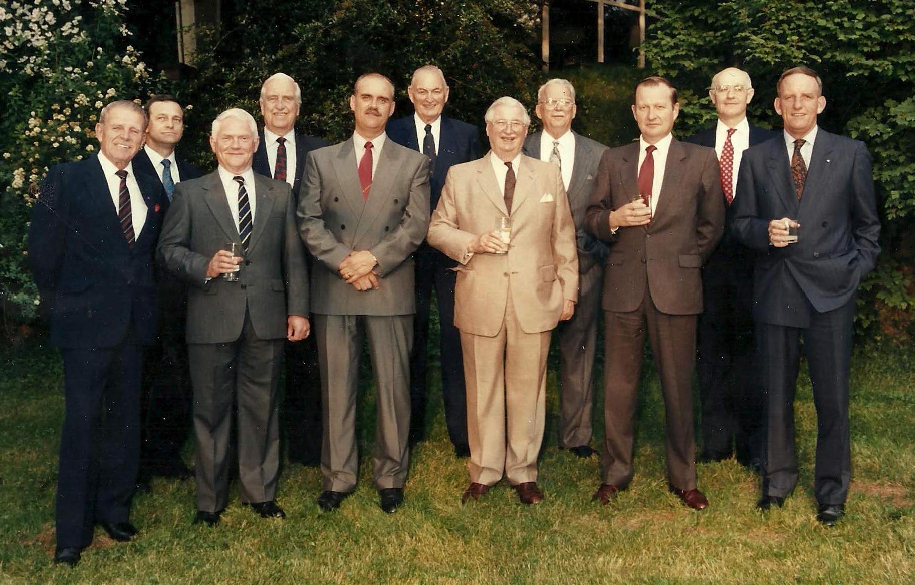 From left to right: Lieutenant-General J. Chouinard, CMM, CD, Commanded 4 Canadian Mechanized Battle Group as a Brigadier, 27 July 1971-13 July 1972. Major-General J.E.P. Lalonde, CD, Commanded 4 Canadian Mechanized Brigade Group as a Brigadier, 9 July 1986-15 September 1987. Lieutenant-General John Elwood Vance, CMM, CD, Commanded 4 Canadian Mechanized Brigade Group as a Brigadier, 19 July 1976-1 July 1978. Lieutenant-General William Alexander Beaumont Anderson, OBE, CD, Commanded 27 Canadian Infantry Brigade as a Brigadier, 15 Oct 1953-31 Oct 1955. Major-General R.G Meating, CMM, CD, MSM, Commanded 4 Canadian Mechanized Brigade as a Colonel, 13 June 1992-1 July 1993. Brigadier-General P.V.B. Grieve, CD, Commanded 4 Canadian Mechanized Battle Group (1973) and 4 Canadian Mechanized Brigade Group (1974), as a Brigadier, 13 July 1972-1 July 1974. Major-General W.C. Leonard, MBE, CD, Commanded 4 Canadian Mechanized Battle Group as a Brigadier, 3 July 1970-27 July 1971. Major-General A.J. Tedlie, DSO, CD, Commanded 4 Canadian Infantry Brigade Group as a Brigadier, 10 December 1964-15 September 1966. Major-General J.M. Robert Gaudreau, CMM, CD, Commanded 4 Canadian Mechanized Brigade Group as a Brigadier, 3 July 1989-13 April 1991. Major-General Tom F. de Faye, CMM, CD, SBStJ, Commanded 4 Canadian Mechanized Brigade Group as a Brigadier, 15 Sep 1987-13 July 1989. Major-General Clive J. Addy, OMM, OStJ, CD, Commanded 4 Canadian Mechanized Brigade Group as a Brigadier, 3 April 1991-13 June 1992.