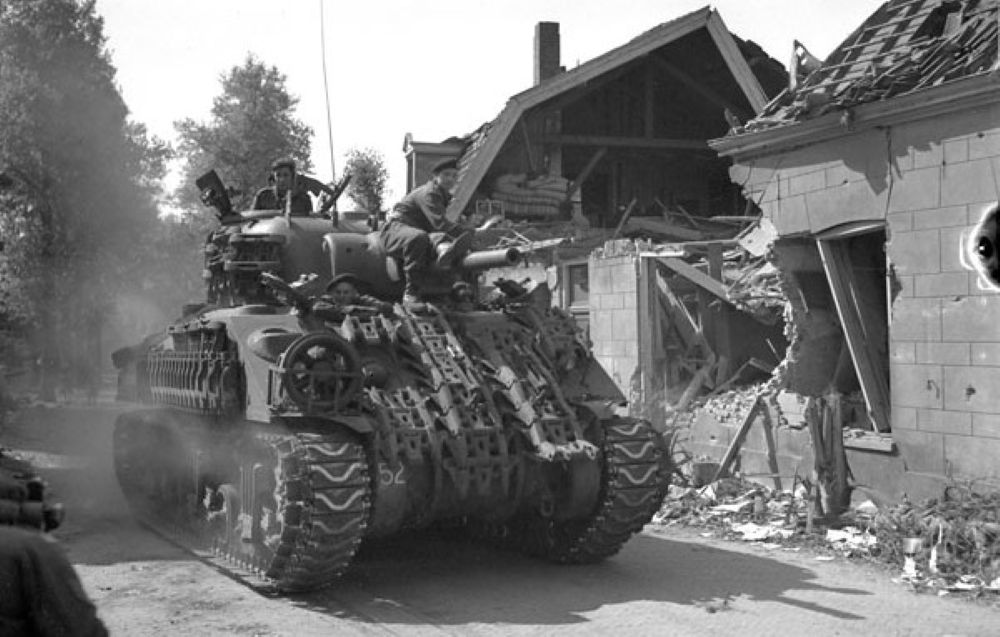 Sherman V tank armed with a 75-mm Gun, 5th Canadian Armour Regiment, 8th Princess Louise (New Brunswick) Hussars, Putten, Netherlands, 18 Apr 1945. Churchill tank tracks attached to this tank as add-on armour. (Capt Jack Smith, Library and Archives Canada Photo, MIKAN No. 3396461)