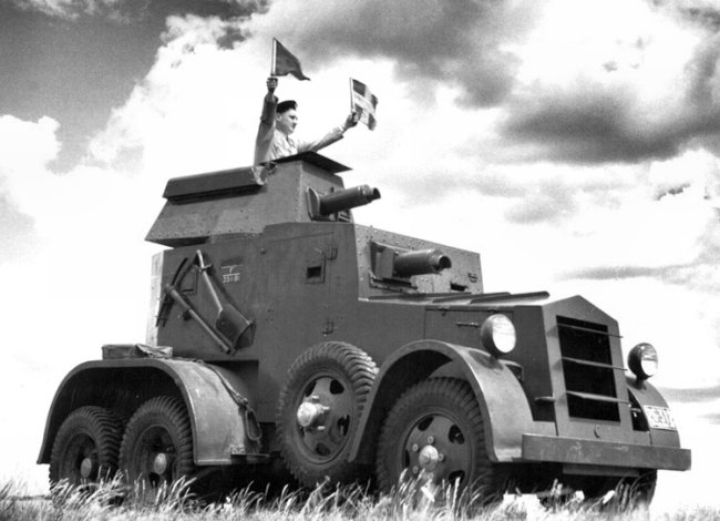 Armament was four 0.303 in Hotchkiss Mk 1 machine guns, one covering each direction. As there were only three crewmen, the gunner had to jump around a lot, though often assisted by the commander. Sometimes a second gunner was carried in the limited space, and often a machine gun was removed to give more room, as the machine guns could be moved from one mounting position to another to cover all sides.