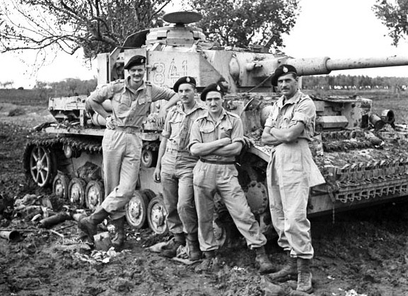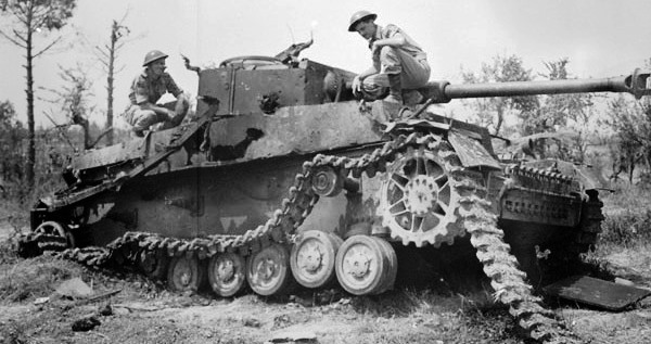 German Panzer IV tank, examined by Lance-Bombardier T. Hallam and Signalman A.H. Wharf, HQ, RCA, 5th Canadian Armoured Division, near Pontecorvo, Italy, 26 May 1944. (Library and Archives Canada Photo, MIKAN No. 3405800)