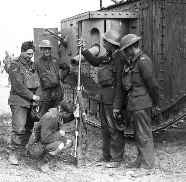 Canadian soldiers alonside a British tank, examining a German anti-tank rifle captured during the Battle of Amiens, August, 1918. (Library and Archives Canada Photo, MIKAN No. 3395388)