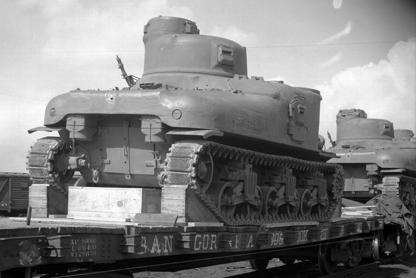 M3 Lee Medium tanks on a railway flatcar. (Library and Archives Canada Photo, MIKAN No. 3285353 and 3285354)