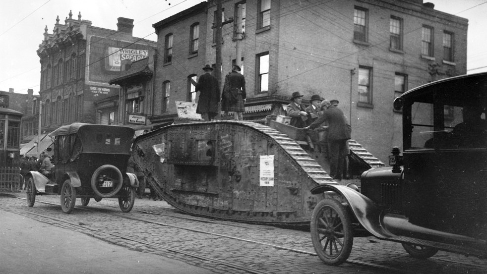 British tank “Britannia” taking part in the Victory Loan Parade, Toronto, Ontario, on 21 Nov 1917. (Library and Archives Canada Photo, MIKAN No. 3408624 and MIKAN No. 3395405). This tank has been preserved in the U.S. Army Ordnance Training and Heritage Center (Formerly known as the U.S. Army Ordnance Museum) that is currently located at Fort Lee, outside Petersburg, Virginia.