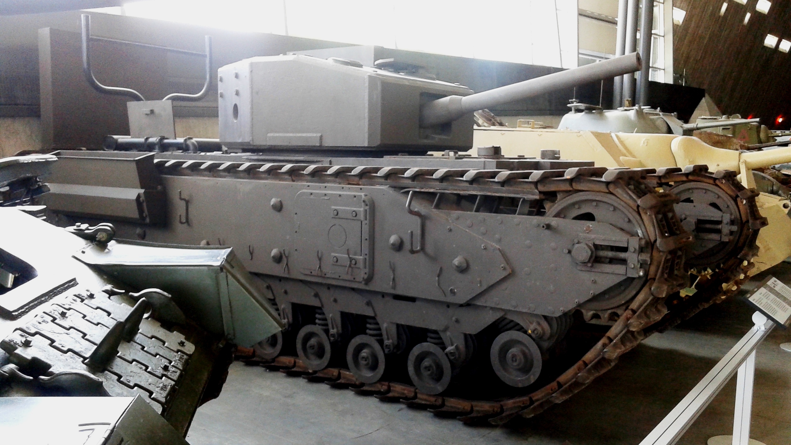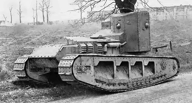 This armoured fighting vehicle was intended for fast mobile assaults. Although the track design appears more “modern” than the British Tanks Mark I to V, it was directly derived from Little Willie, the first tank prototype and was unsprung. The crew compartment was a fixed square turret at the rear of the vehicle, and two engines of the type used in contemporary double-decker buses were in a forward compartment, driving one track each.