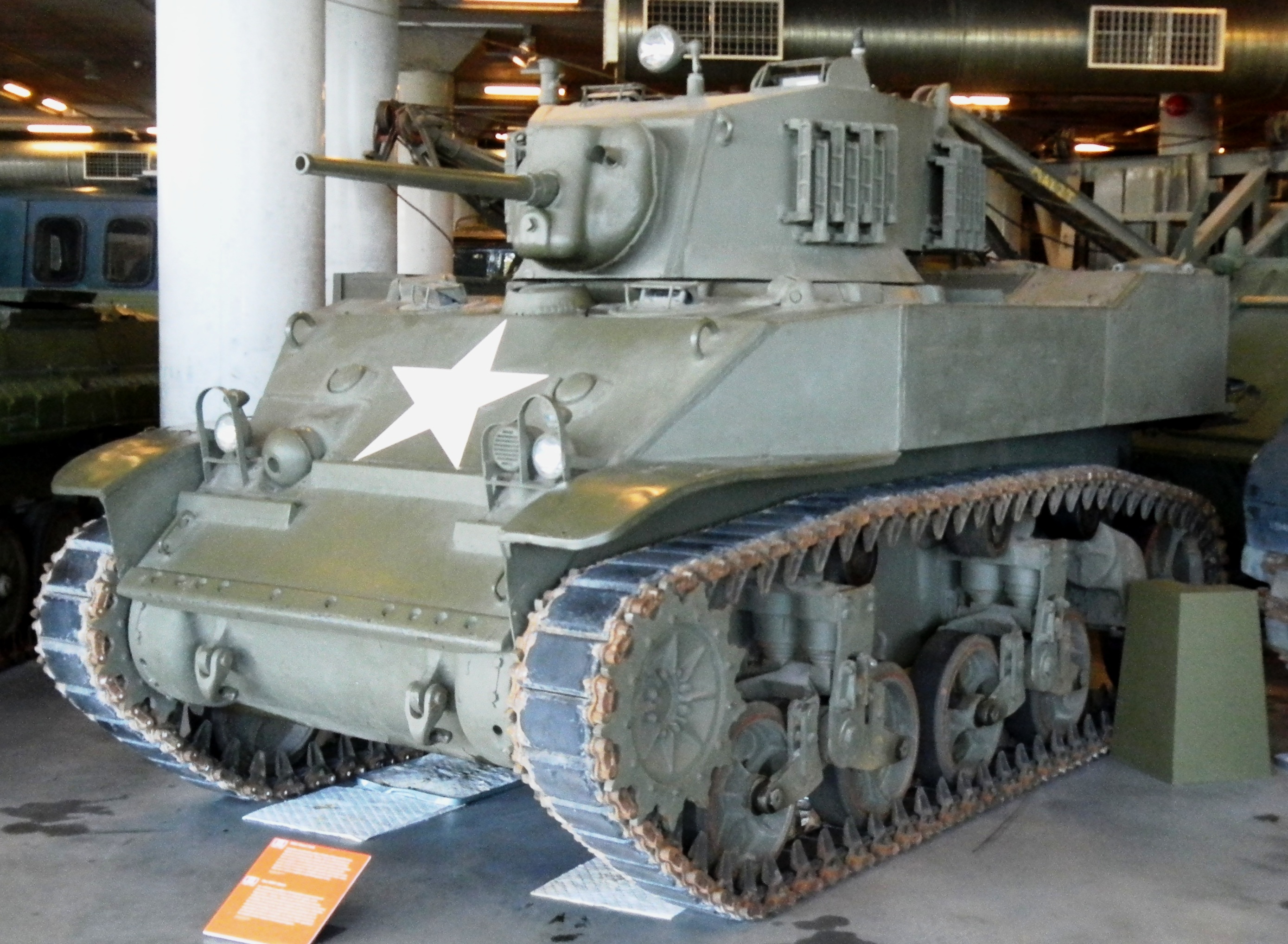 The M3 was tall and roomy: the power transmission ran through the crew compartment under the turret cage to the gearbox driving the front sprockets. Steering was by differential braking, with a turning circle of 11 m. The vertical volute suspension units included a return roller made with self-contained and readily replaced units bolted to the chassis. The turret was power-traversed by an electro-hydraulic system – an electric motor providing the pressure for the hydraulic motor. This rotated the turret fully in 15 seconds. Control was from a spade grip on the gun. The same motor provided pressure for the gun stabilizing system.