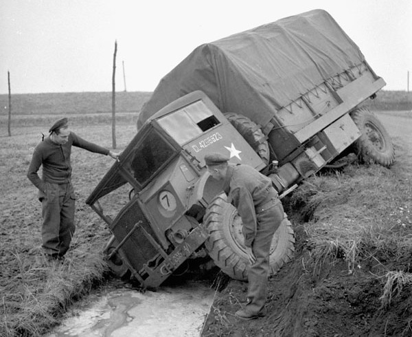 Personnel of 2nd Canadian Infantry Division Signals with Personnel of the Royal Canadian Corps of Signals (RCCS), 2nd Canadian Infantry Division, examining a Ford three-ton truck which sank into a ditch on the Beveland Causeway, Netherlands, 27 October 1944. (Library and Archives Canada Photo, MIKAN No. 3201518)